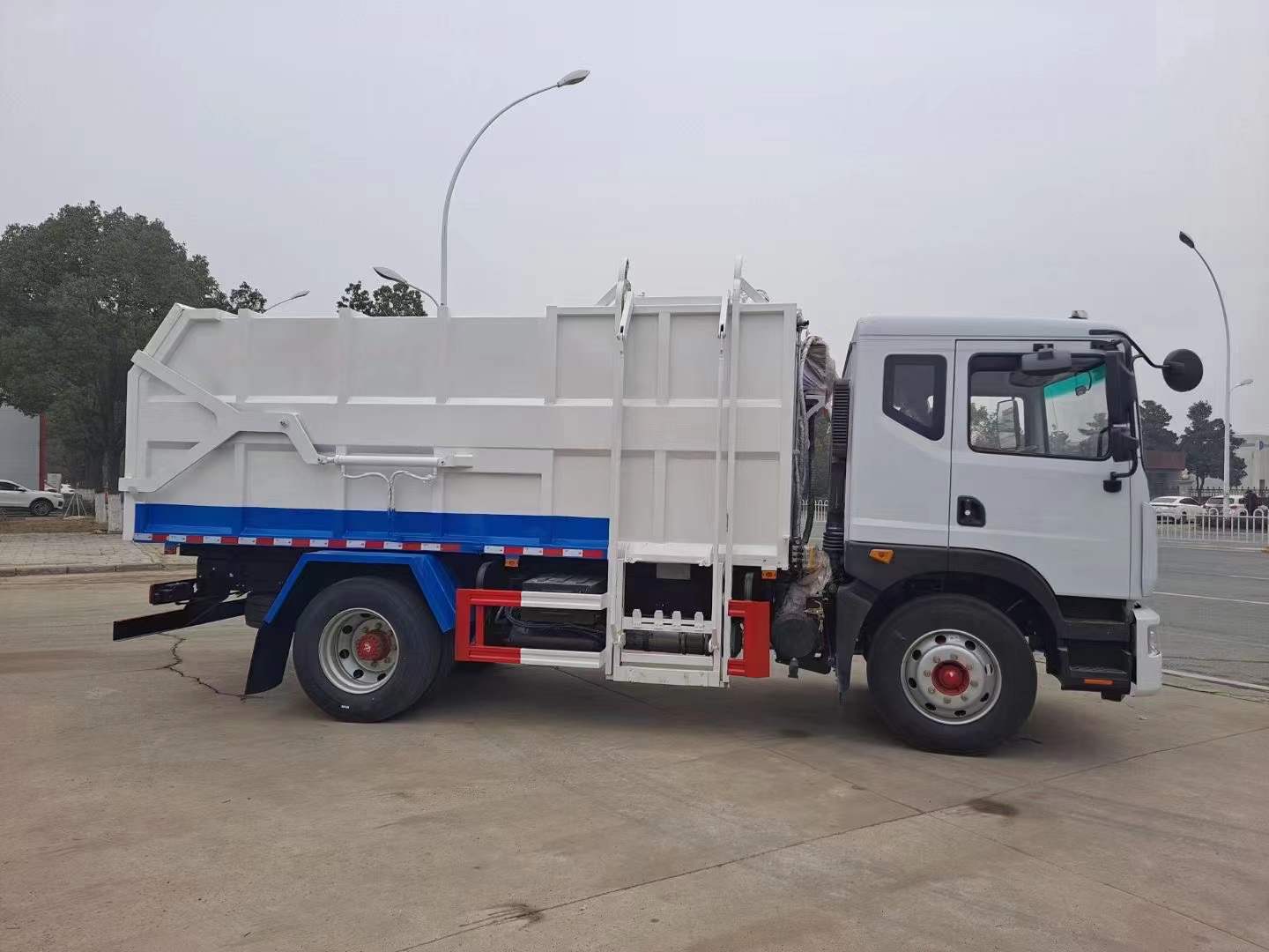 上裝配置:最大車型的掛桶圾垃車,容積大(15方),裝載量多,尾部帶剪刀式液壓開啟,更方便快捷,尾門硅膠密封條滴水不漏,拉桿式鏈條提升機可掛240L/120L標準垃圾桶。